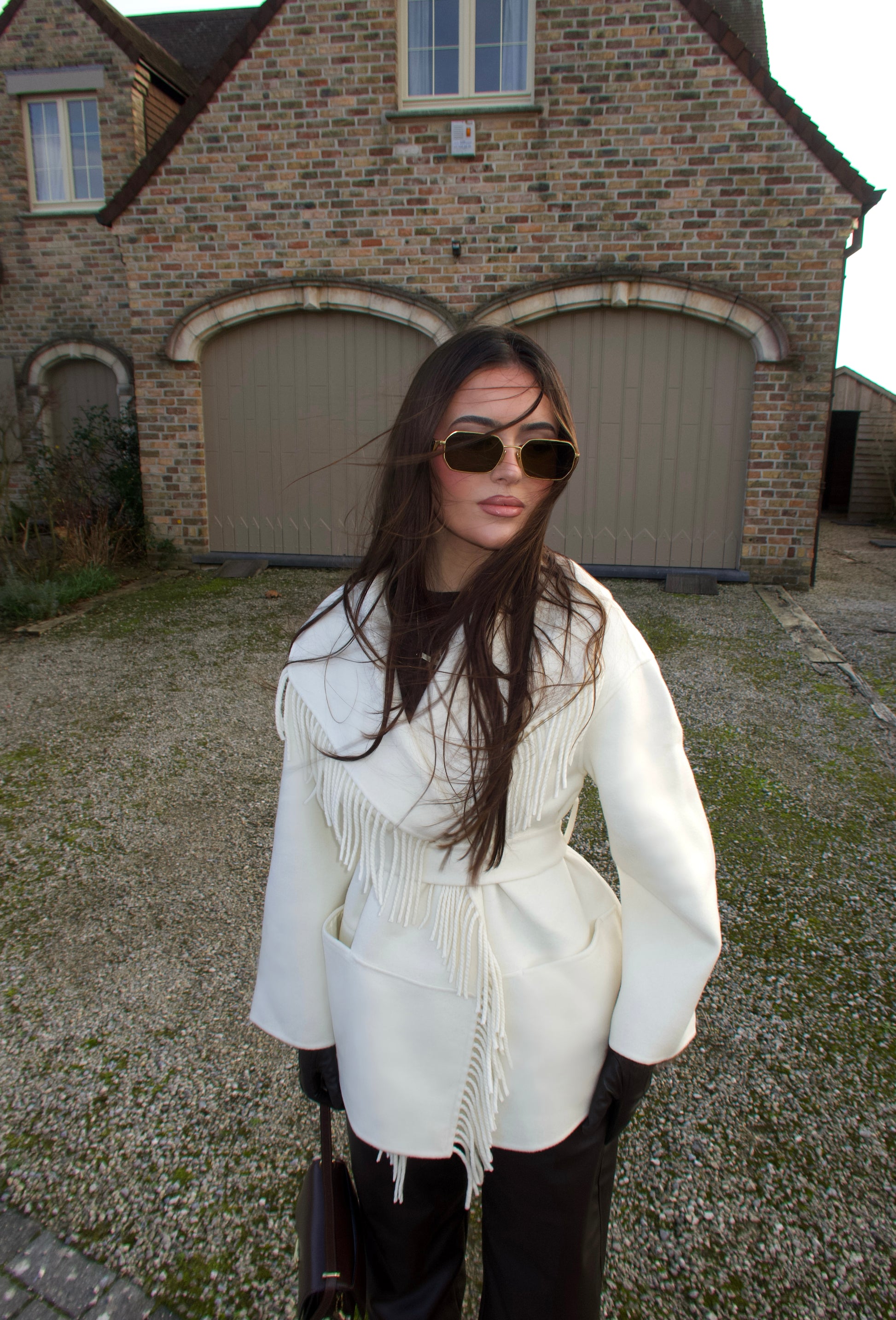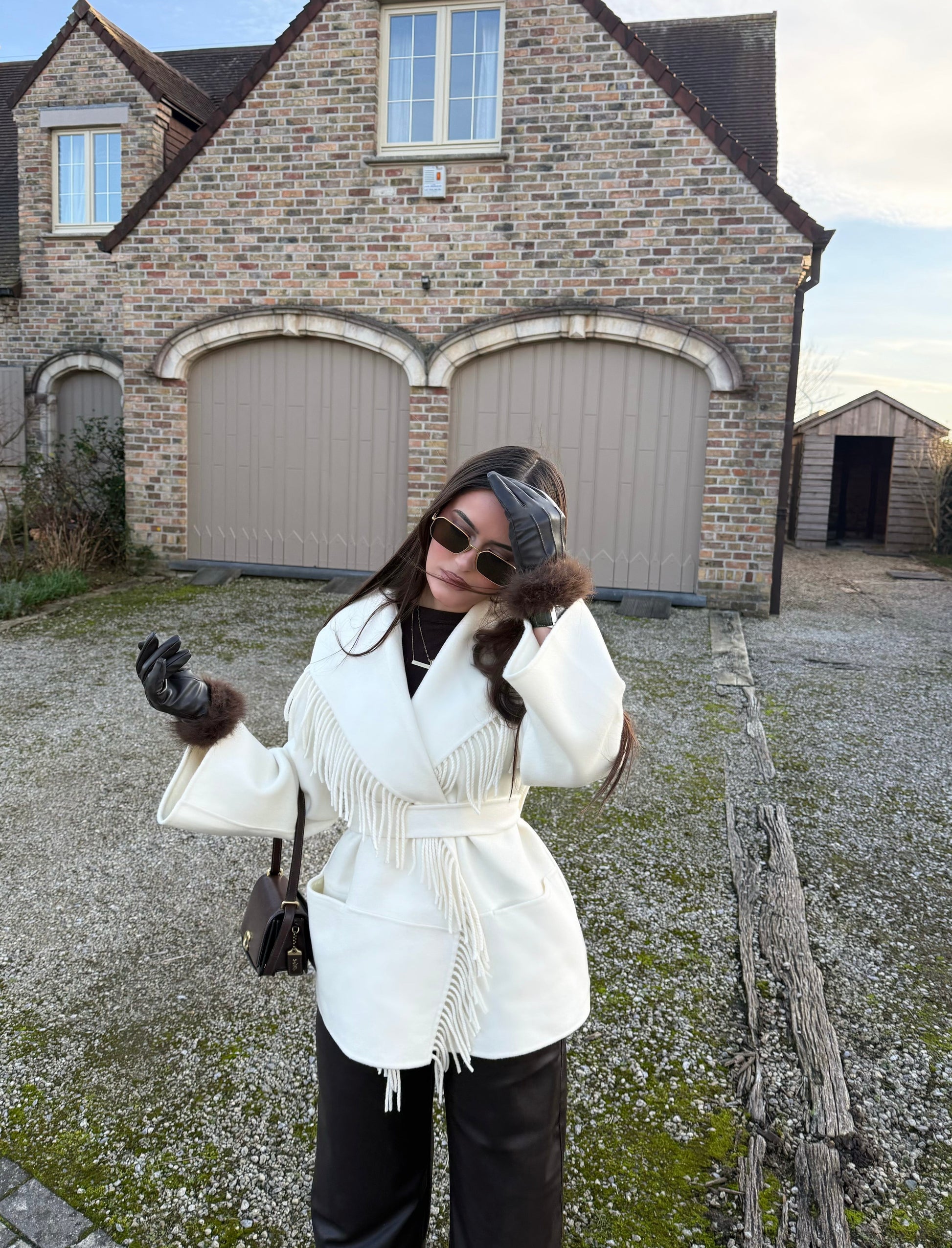 Style redefined: wool coat with fringe detail and a belt to make you stand out in style.