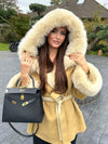 Luxury redefined: wool coat with sumptuous fox fur hood and sleeves for a bold statement.