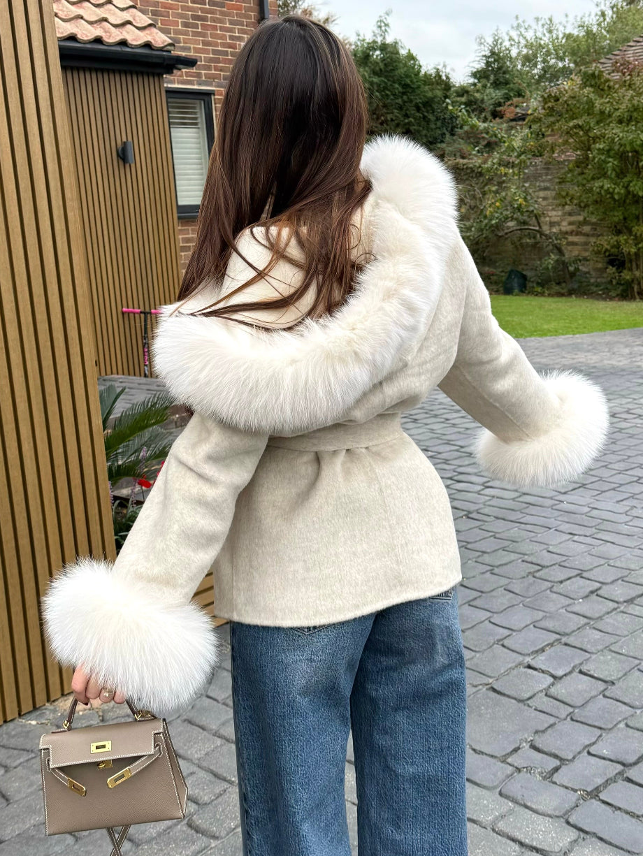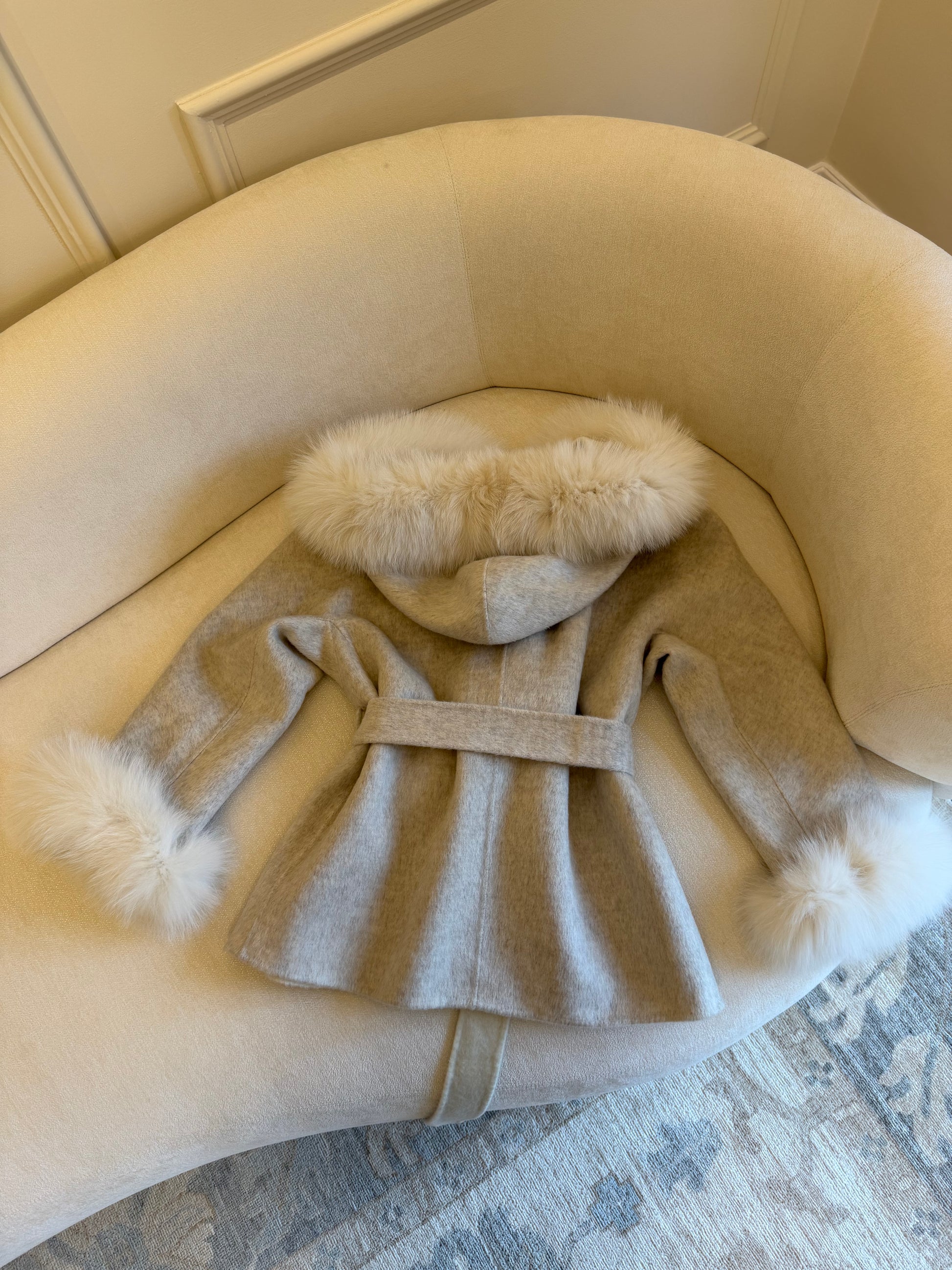 Luxury redefined: wool coat with sumptuous fox fur hood and sleeves for a bold statement.