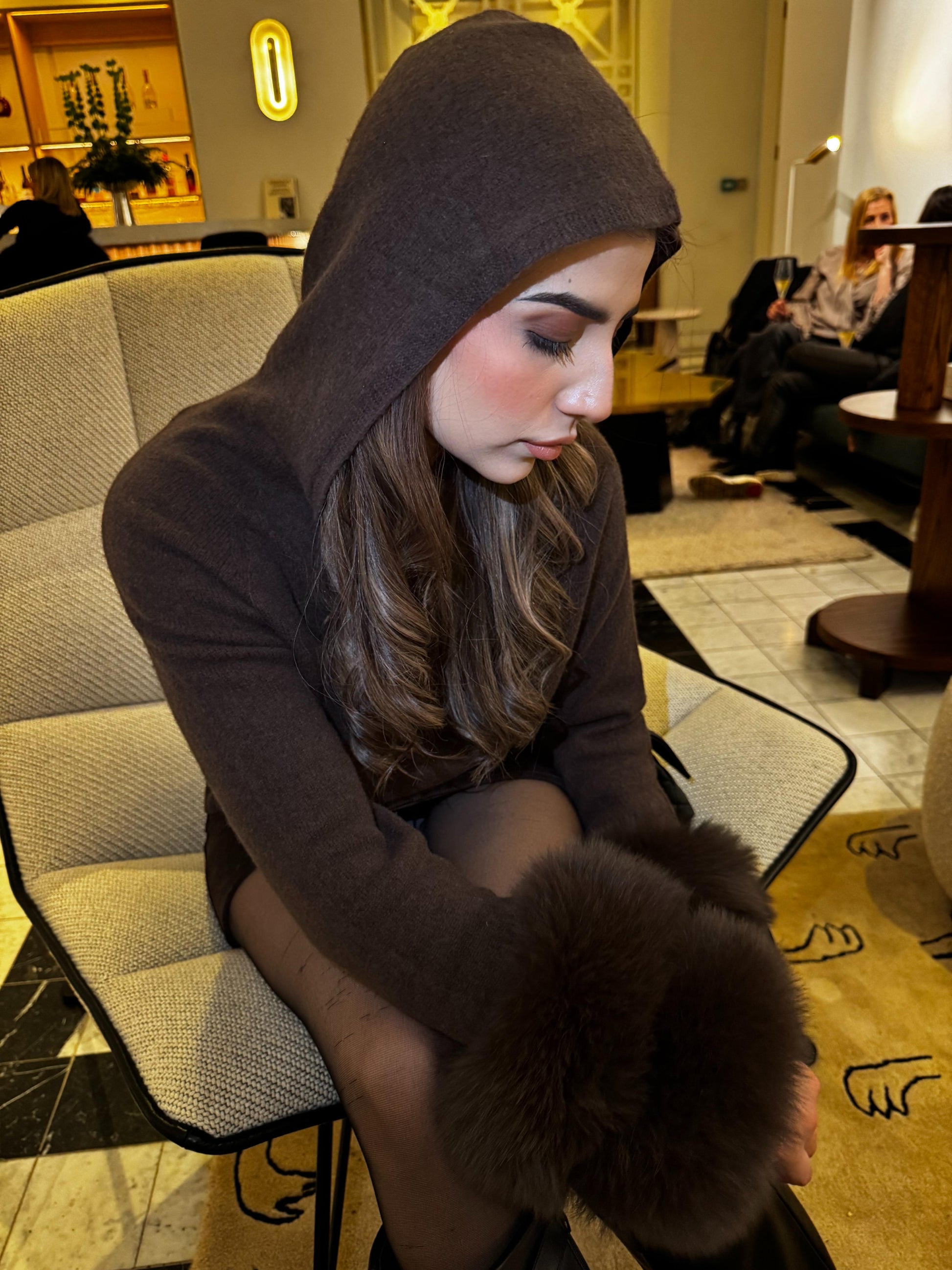 A warm wool sweater with hood finished with thick, plush fox fur for a rich, textured look. Cozy, insulating, and effortlessly elegant.