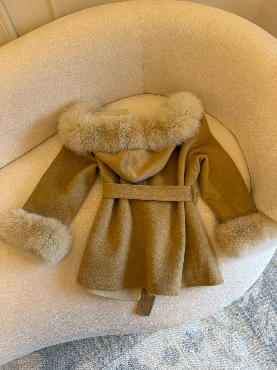 Luxury redefined: wool coat with sumptuous fox fur hood and sleeves for a bold statement.