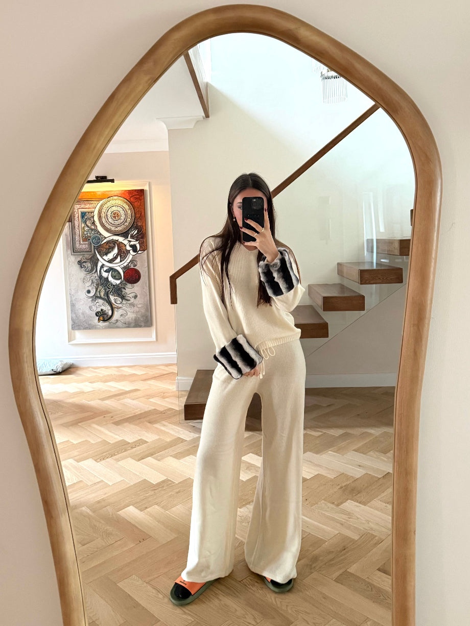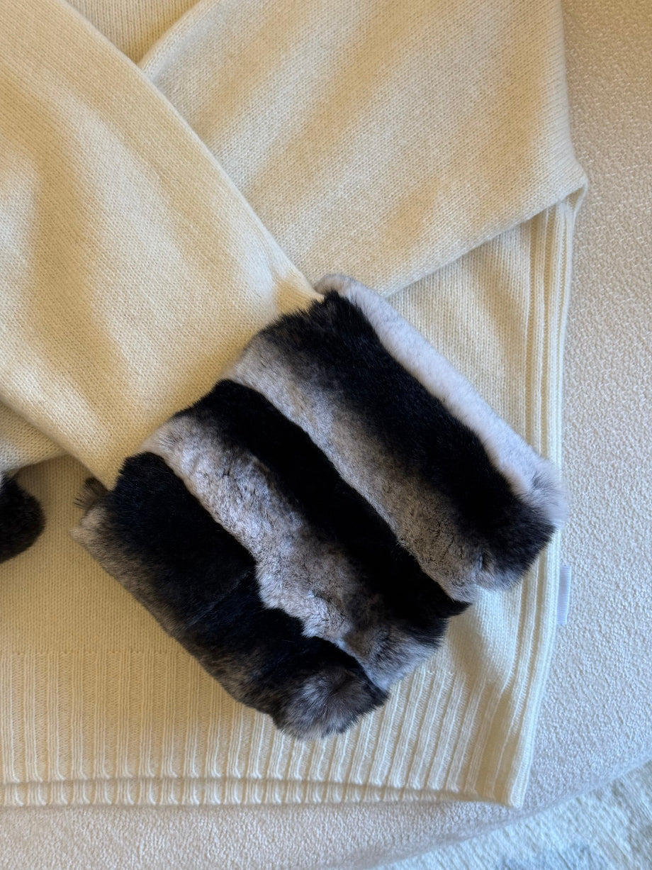 Luxurious wool-cashmere set with plush Rex rabbit sleeves — stylish, cozy, and unmistakably bold.