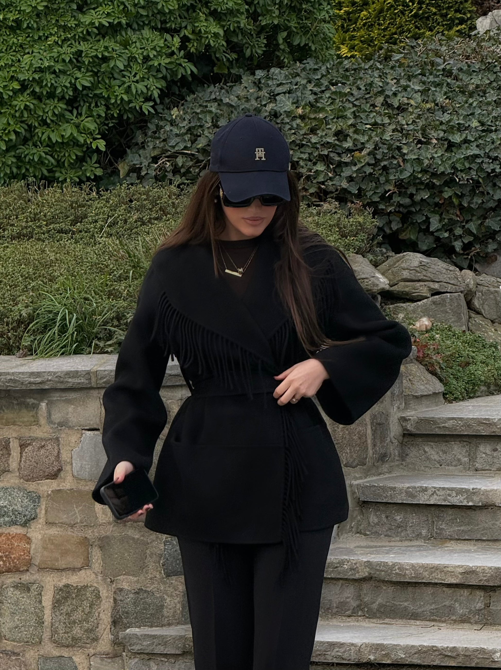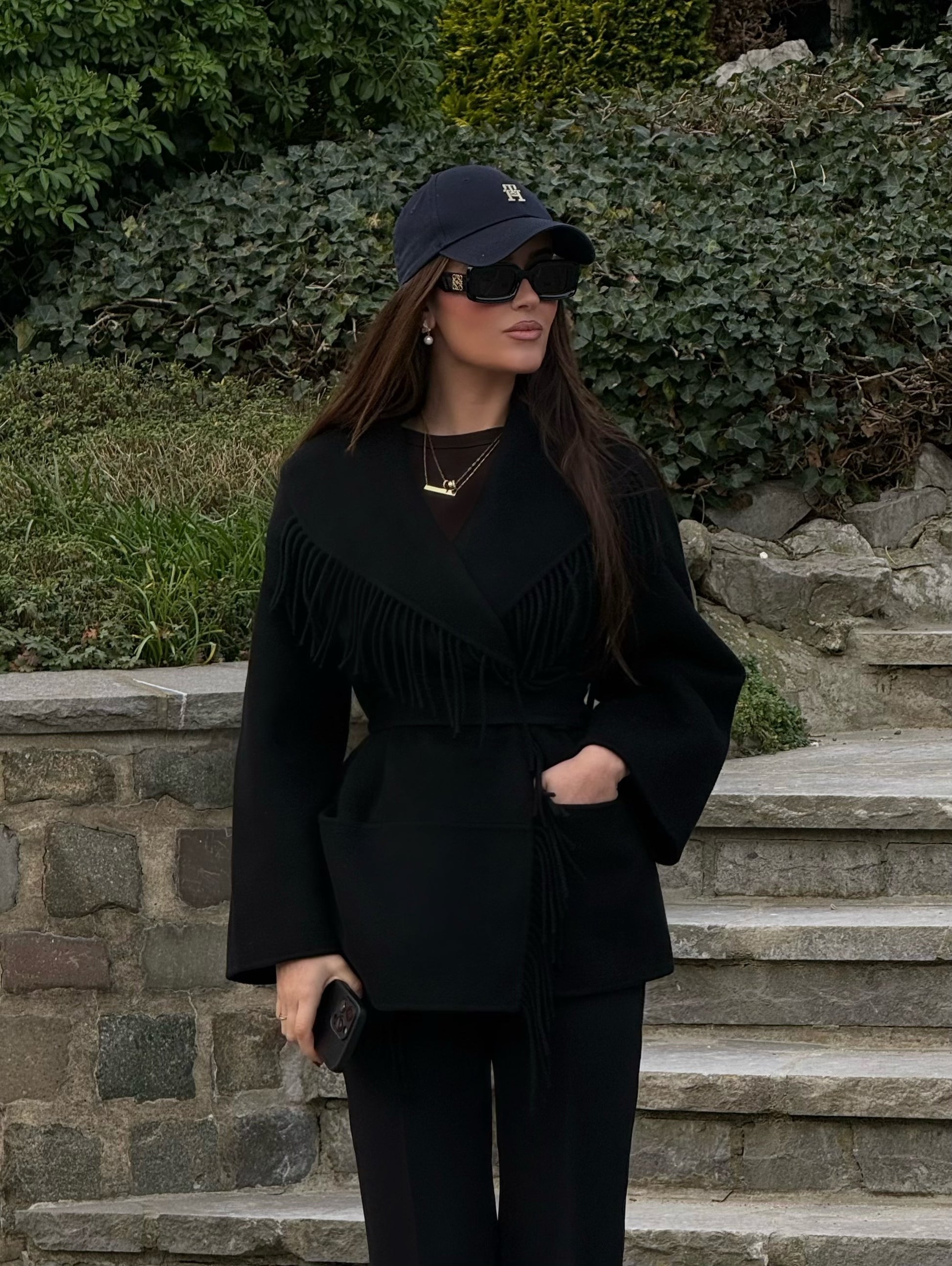 Style redefined: wool coat with fringe detail and a belt to make you stand out in style.