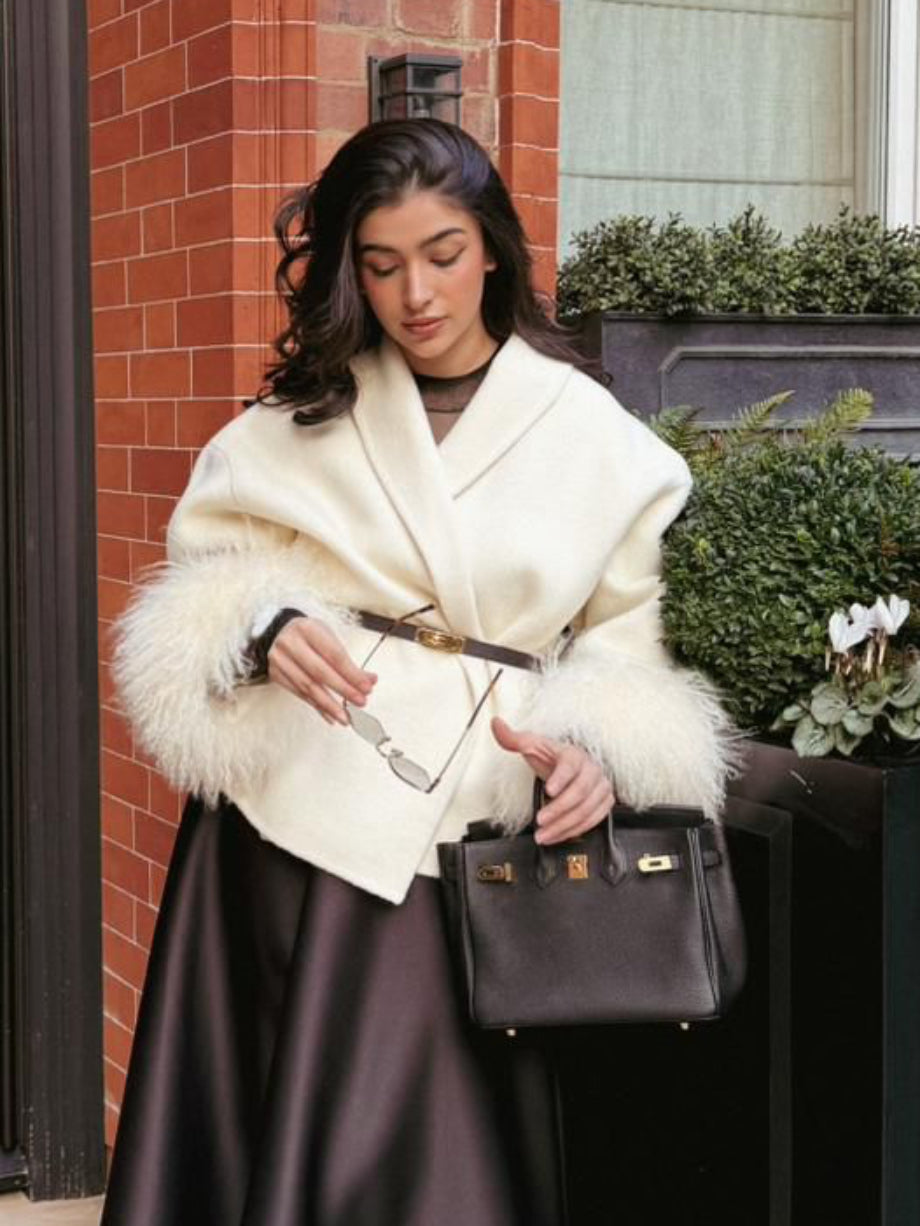Luxury redefined: wool coat with voluminous Mongolian fur sleeves for a bold statement.