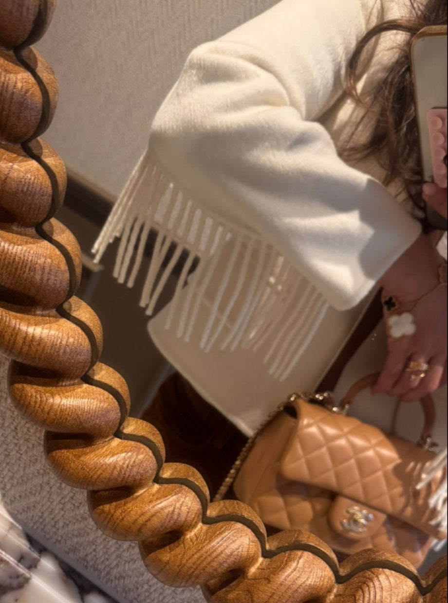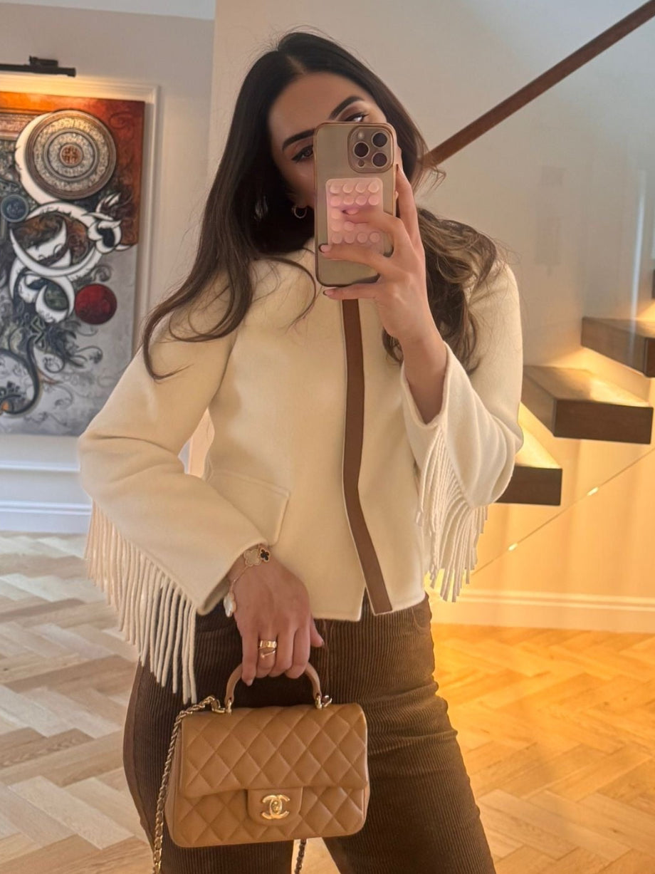 Another standout piece of the season. Our ultra-chic SNOW wool-cashmere jacket with a big, bold leather detail. Limited quantity available.