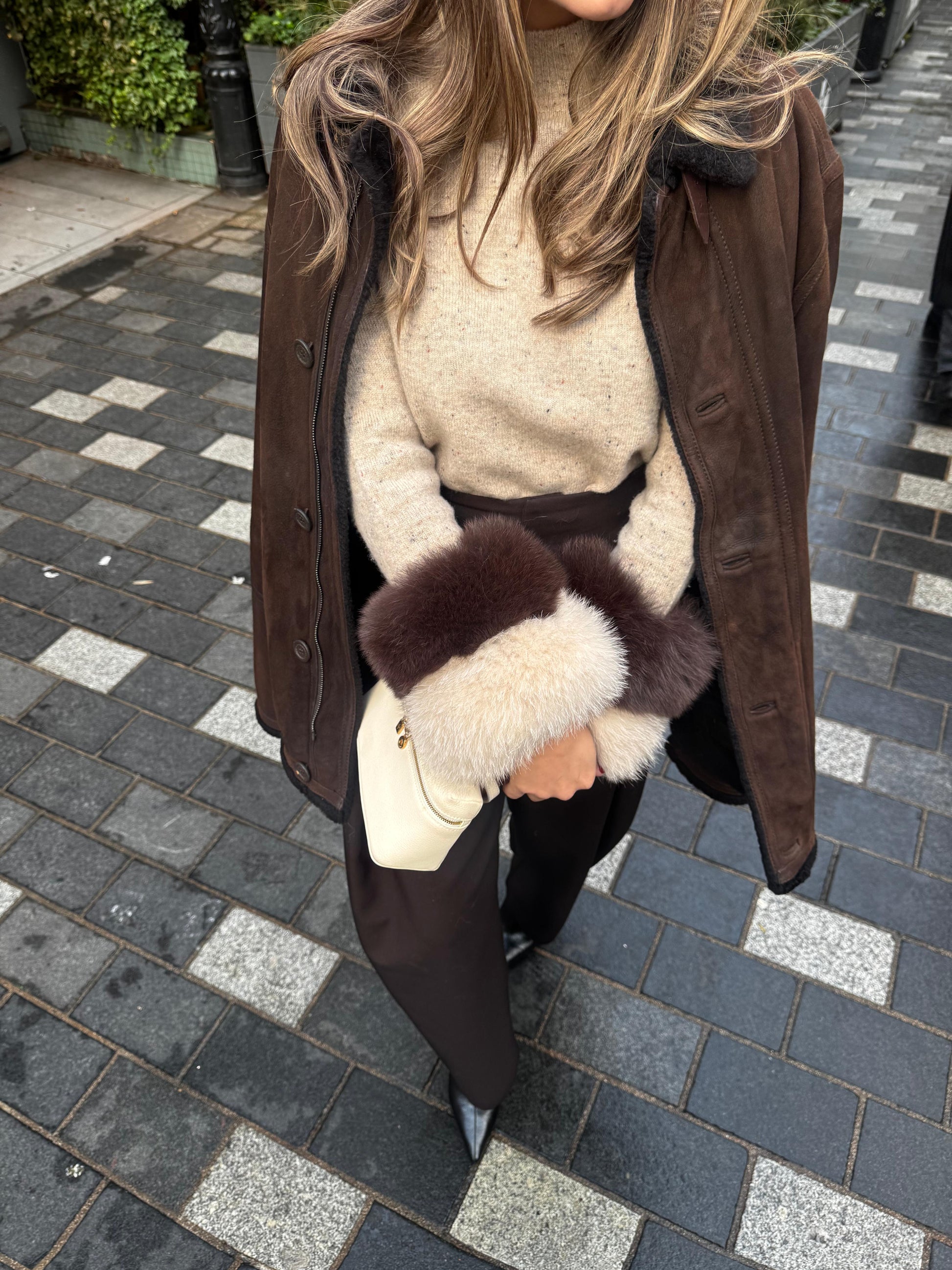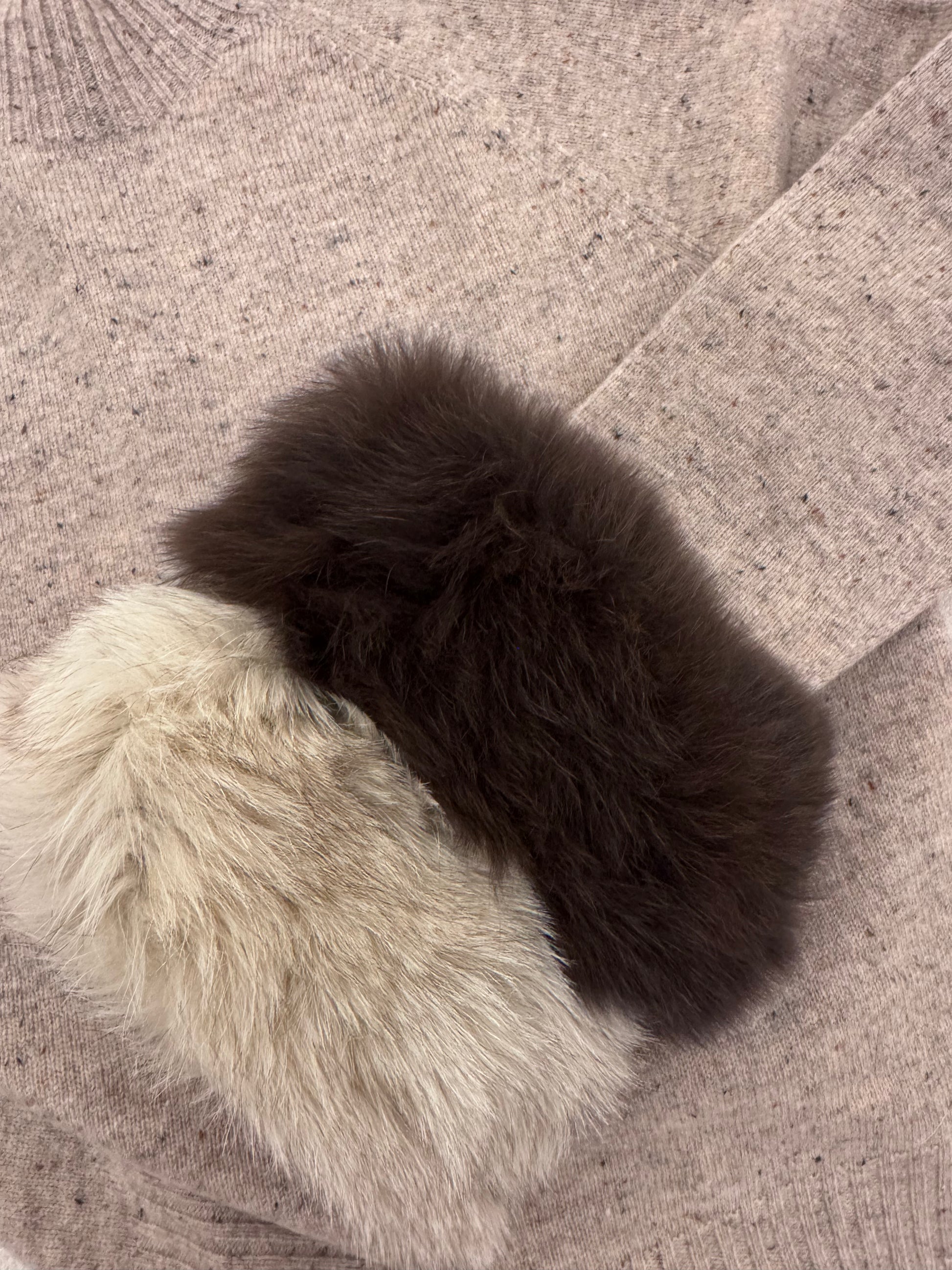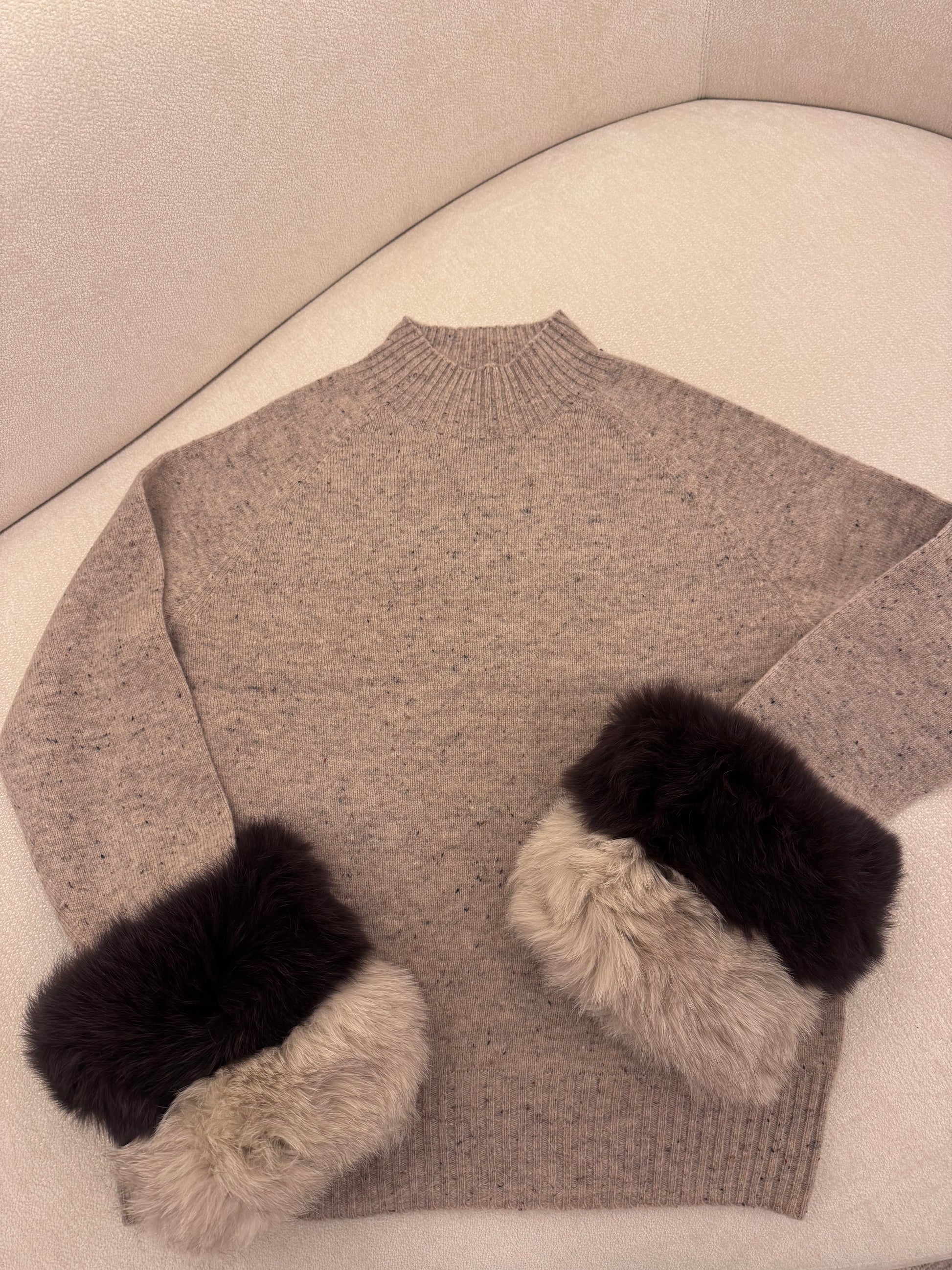 A warm wool sweater finished with thick, plush fox fur for a rich, textured look. Cozy, insulating, and effortlessly elegant.